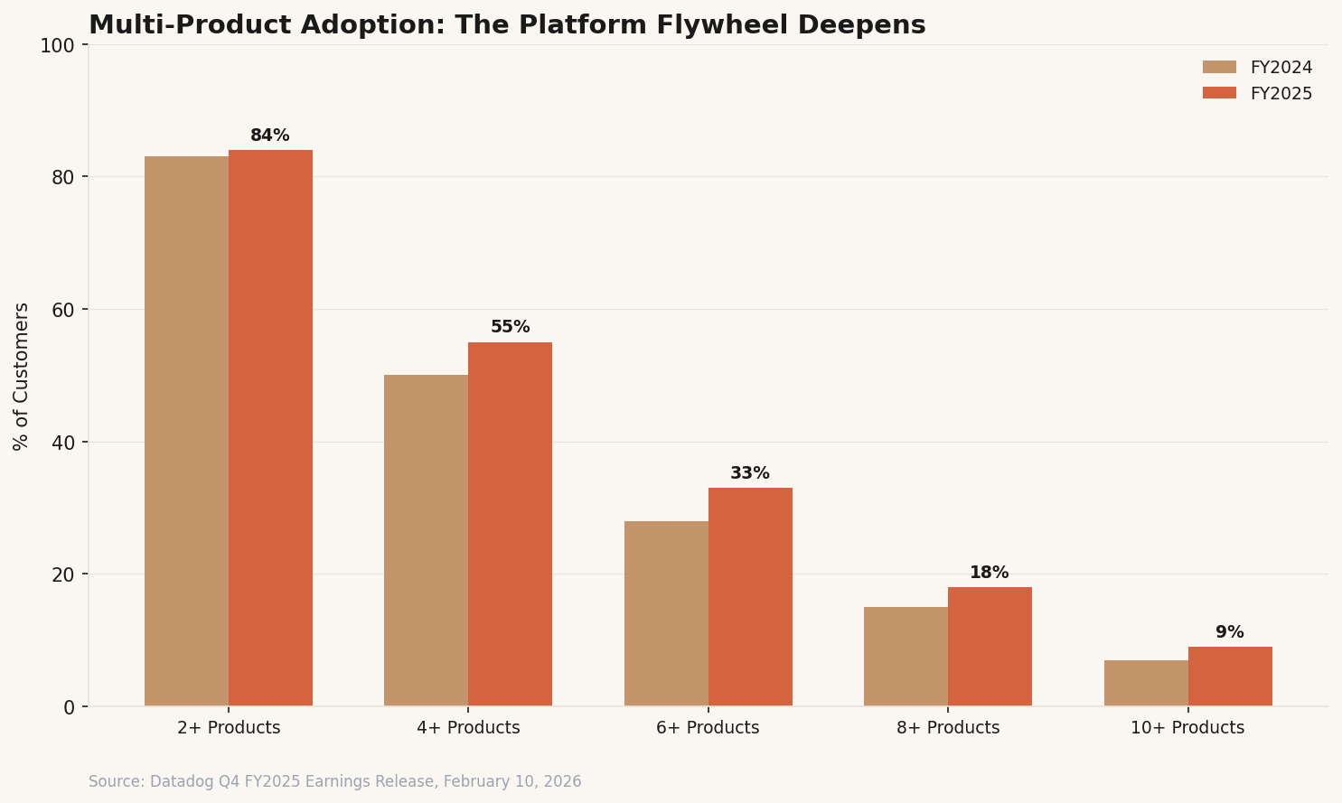 The multi-product adoption data tells the deeper story. At the end of Q4 FY2025, 84% of customers used two or more products (up from 83% a year ago), 55% used four or more (up from 50%), 33% used six or more (up from 28%), 18% used eight or more (up from 15%), and 9% used ten or more (up from 7%). Every single tier increased year over year (Datadog Q4 FY2025 Earnings Release, February 10, 2026). The steepest acceleration is in the deeper tiers, which signals that customers who already trust the platform are adopting new products faster than new customers are landing.